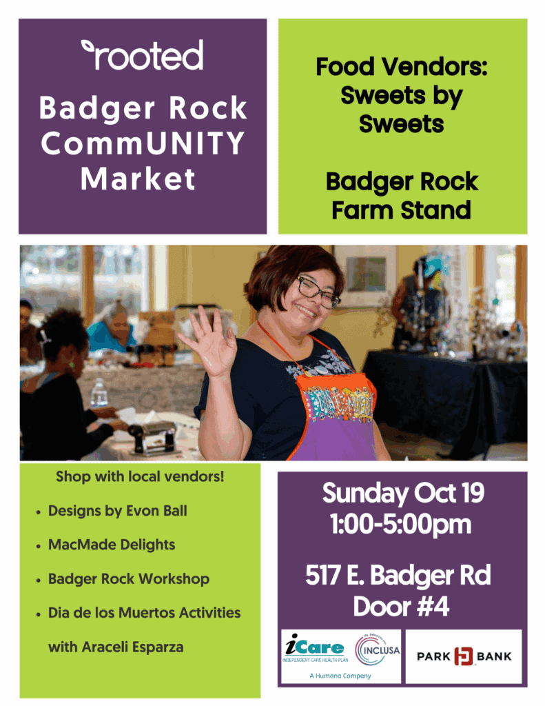 The Badger Rock Community Market and Farm Stand returns every other Sunday afternoon from 1:00-5:00. Featuring local vendors, pop-up food, the Badger Rock Farm Stand, in-person community workshop, and fun for the whole family! SNAP is accepted, and reusable bags are provided. To access the event, enter through the doors marked “Badger Rock Center” on the side of the building facing Badger Park, next to the Southside Elementary playground.